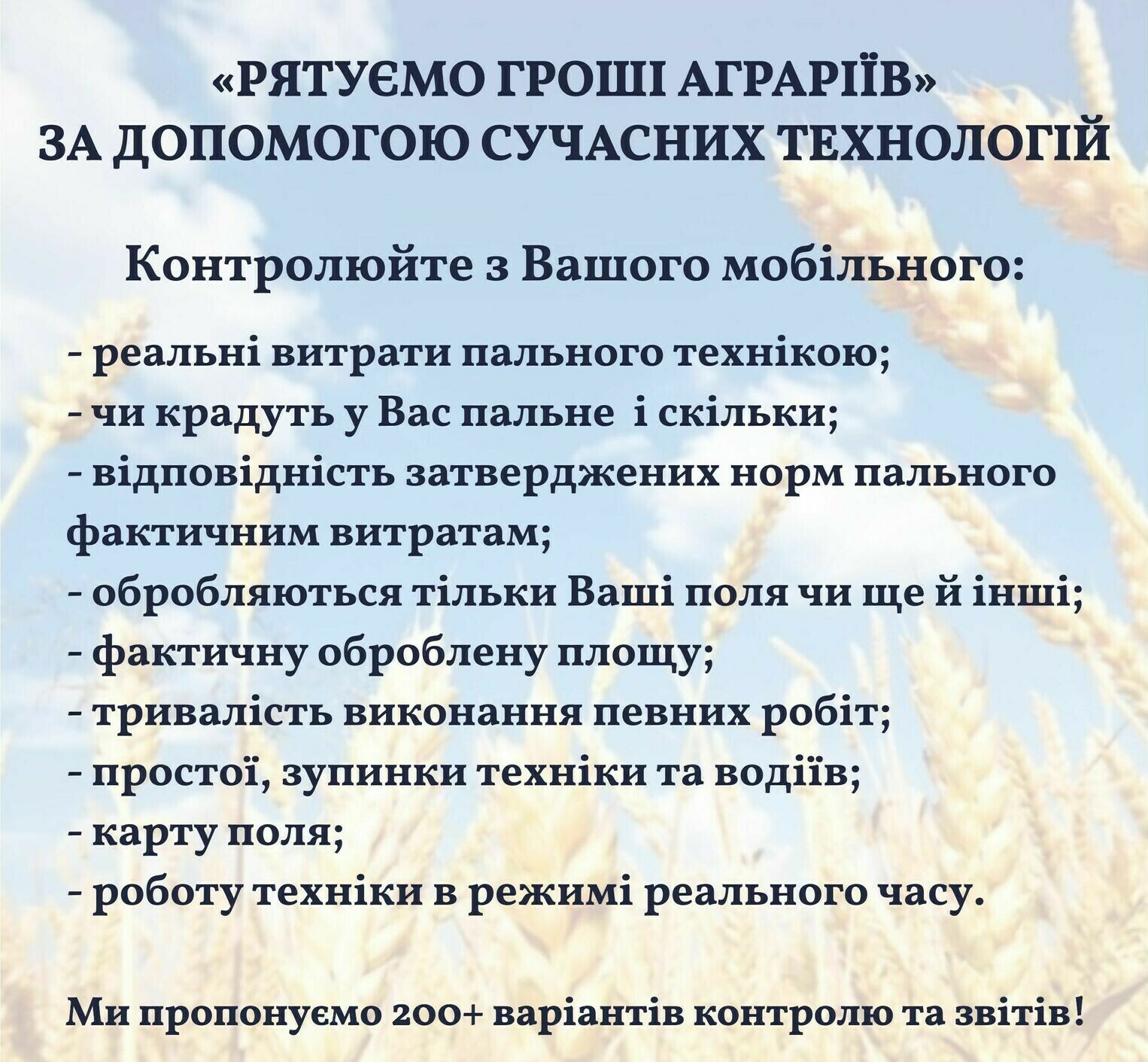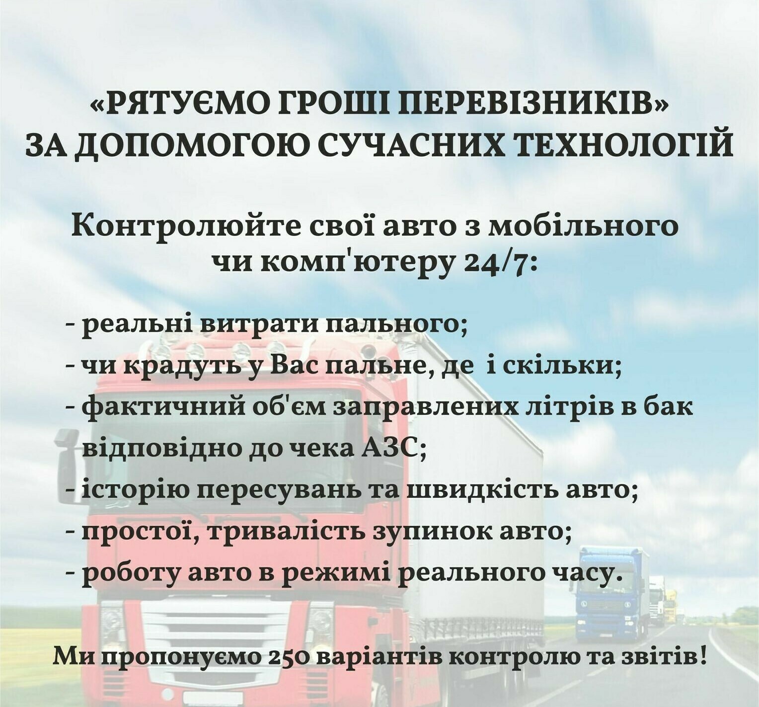 Встановлення GPS трекерів та датчиків рівня пального на вантажівки, аграрну техніку, особистий транспорт, водний транспорт та мототехніку. Контроль пересування транспорту та витрат пального