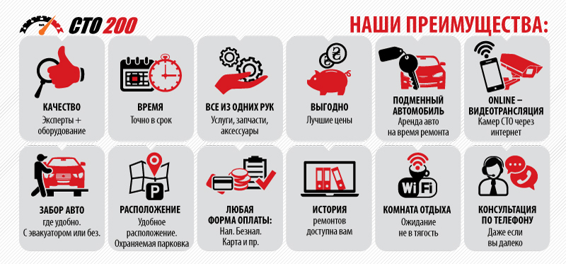 Услуга подменного автомобиля. On-line видеонаблюдение за ходом ремонта для клиентов СТО. Любая форма оплаты. Бережно храним историю ремонта и замены запчастей.